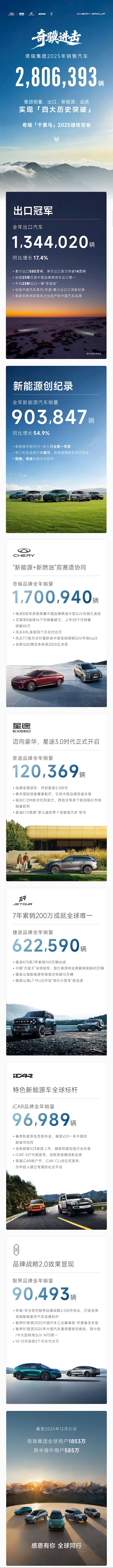 目前,奇瑞集团全球用户已达1853万,其中海外用户为585万,奇瑞集团正深耕全球化战略。